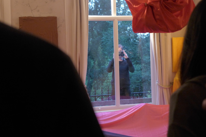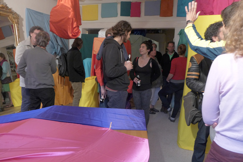A girl asks why we still call the covered paintings ‘paintings’. Lola says it’s a good question. The girl says she’s not defining the stuff by what is under it. For her the whole lot is an action. It’s not about the individual objects that are covered.