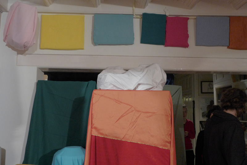 A guy mentions the objects are not only wrapped, but that the cloth is also draped. He points particular stuff out. “This painting is draped, that one is wrapped”. Lola says some objects needed the one action, others the other.