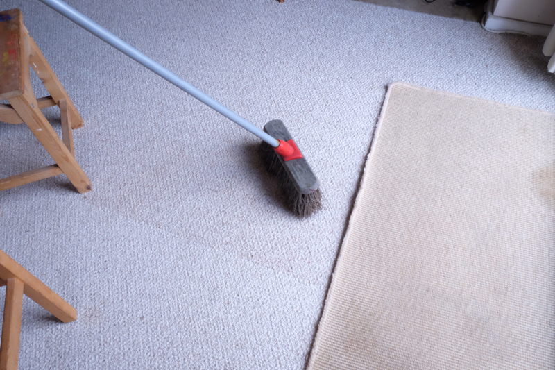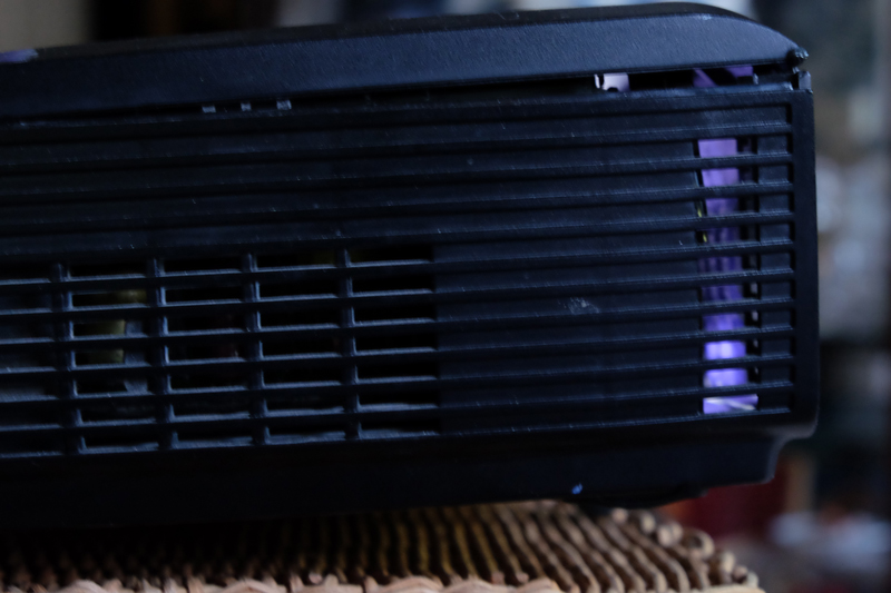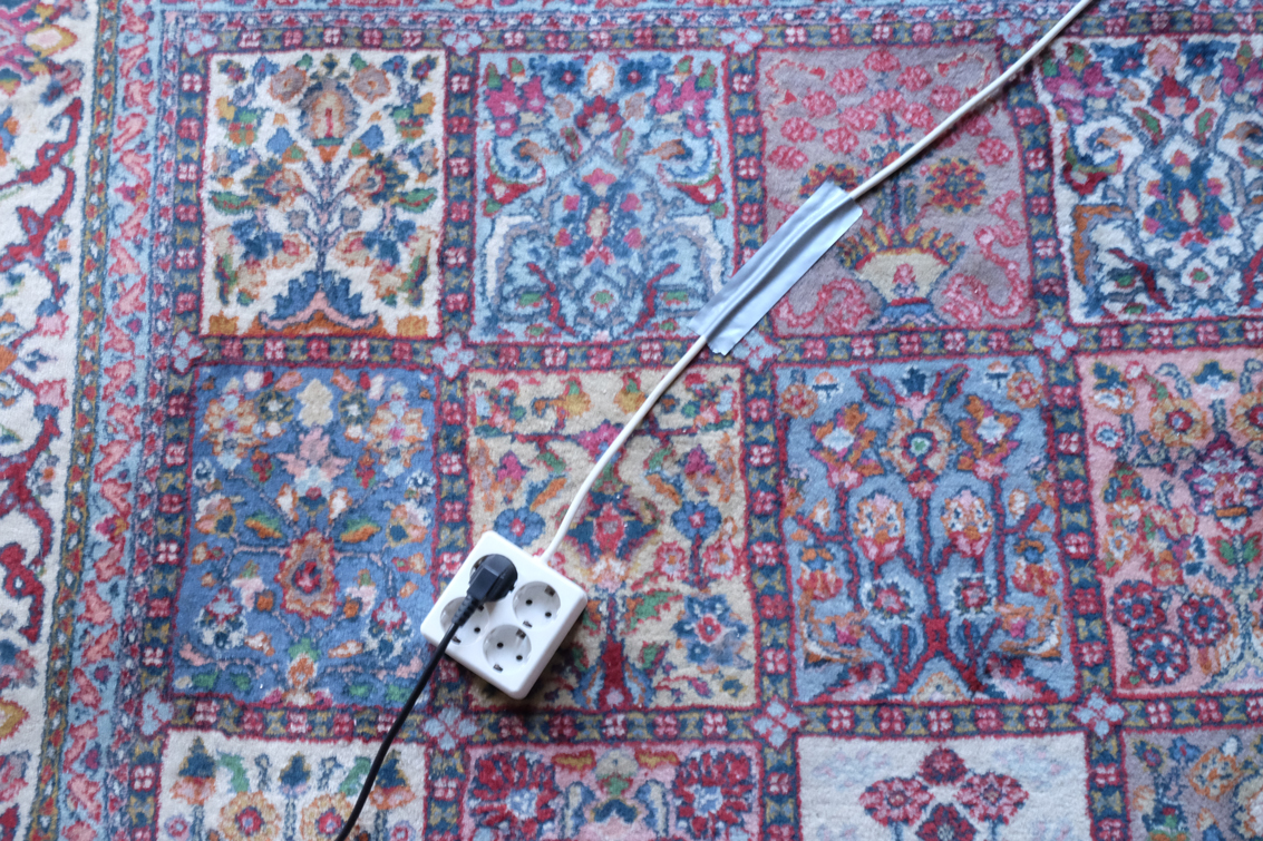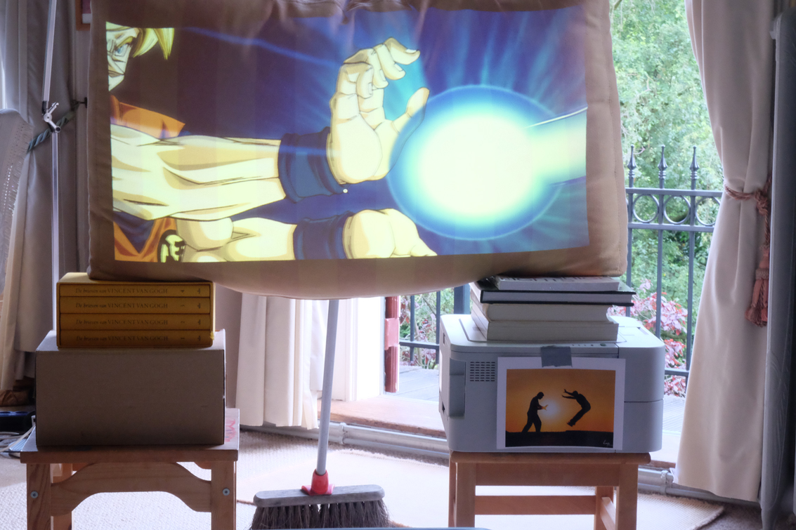 A broom stabilises the projection-cushion. It’s position is tricky. I’m amazed that no one fell over it yet.