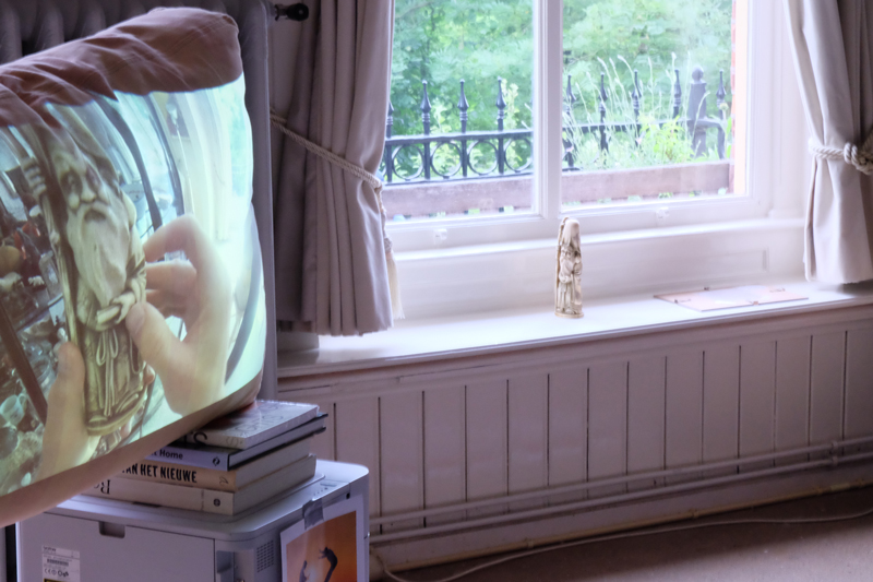Looking at the movie I get the feeling Jacob really absorbed the environment of this house. The movie is filmed here with, what I presume, a GoPro attached to his head. He grasps items of the house and narrates them to the viewer. It’s as if Jacob associatively loses himself in elements of the interior. The first visitors look at the movie silently. Their silence speaks of amusement.