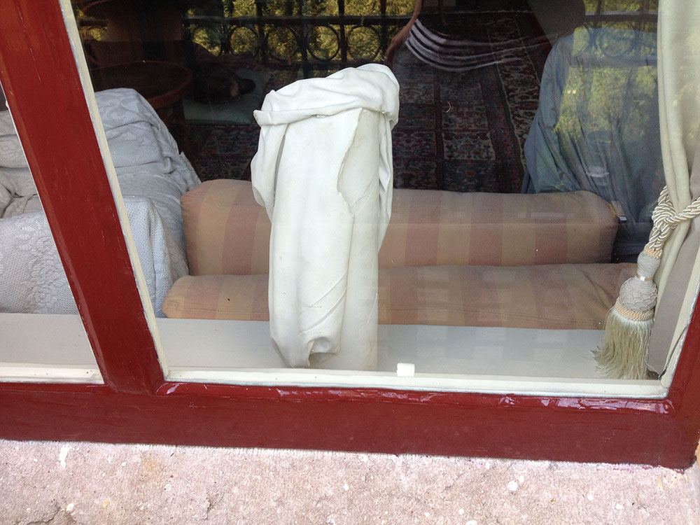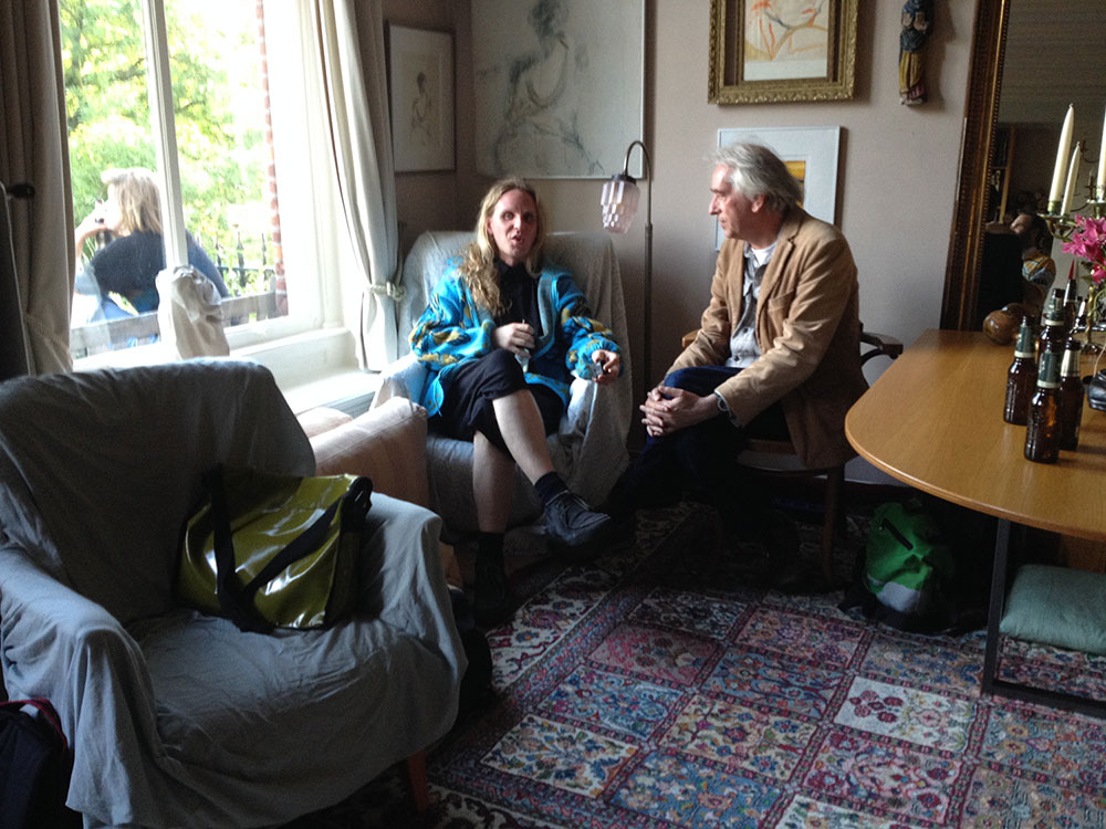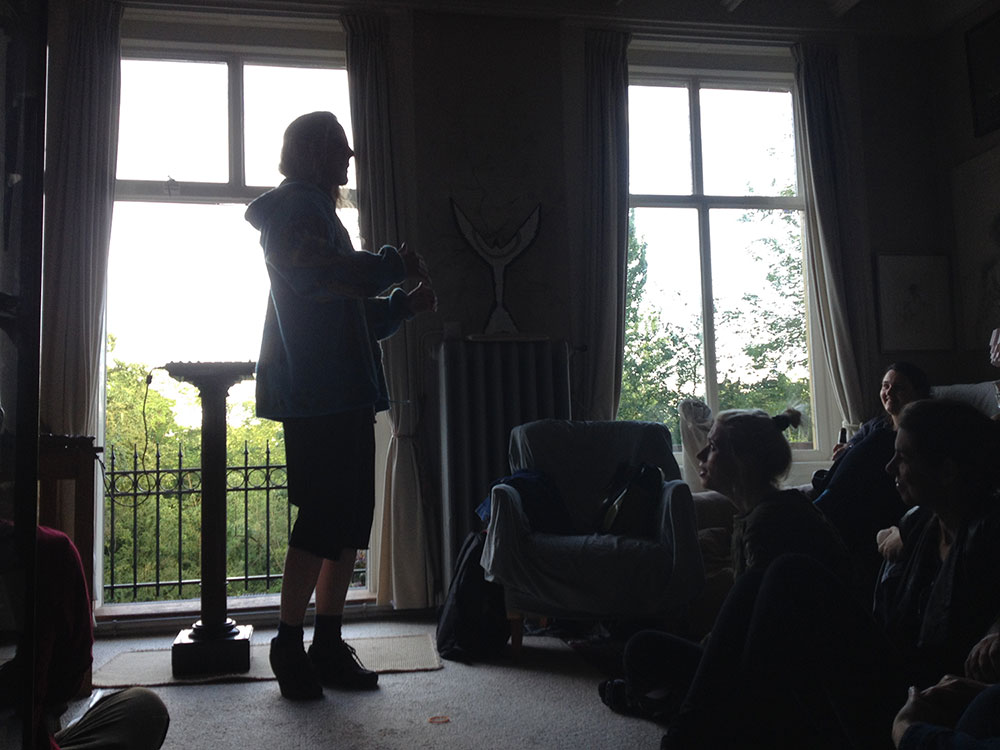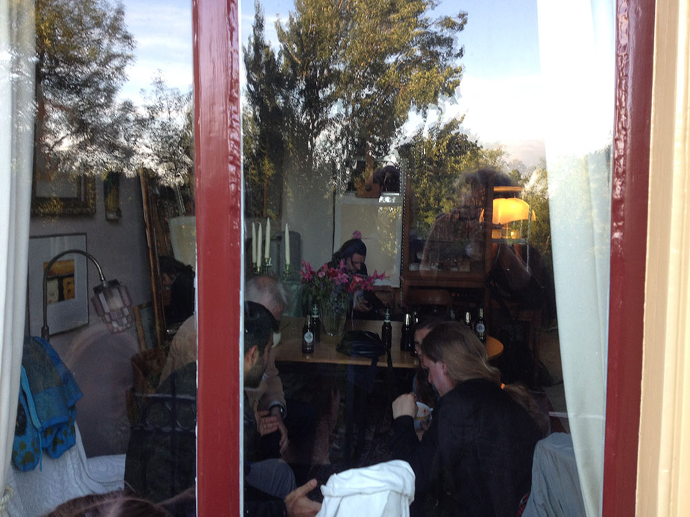 Kerouac is right: the treetops are dancing ecstatically. Clouds as swipes above us. Such a beautiful mansion and than that pvc pipe. Looking into the gardens – that wealth, is it treating you nicely? I think so – here money has been transferred into green lushness. The green budgerigars flying through it complete it. To my right another house, through the window I see a puzzled person at a table with hands on his head. When I look closer I see it’s a big bunch of roses in a vase. In the meantime we wait; cigarettes are lighted as we wait for the blond-haired Icelandic boy with the frame around his neck to begin his thing.