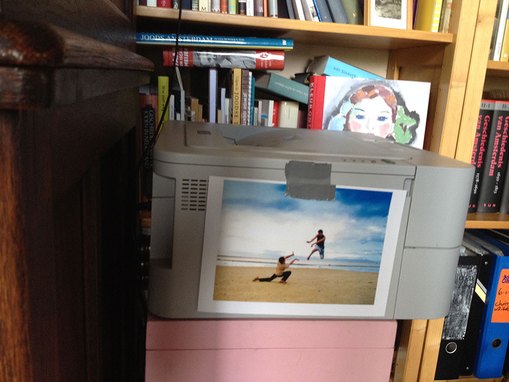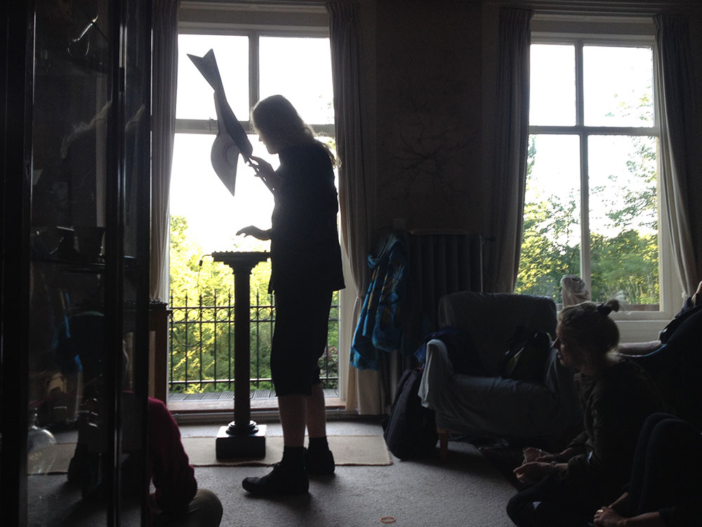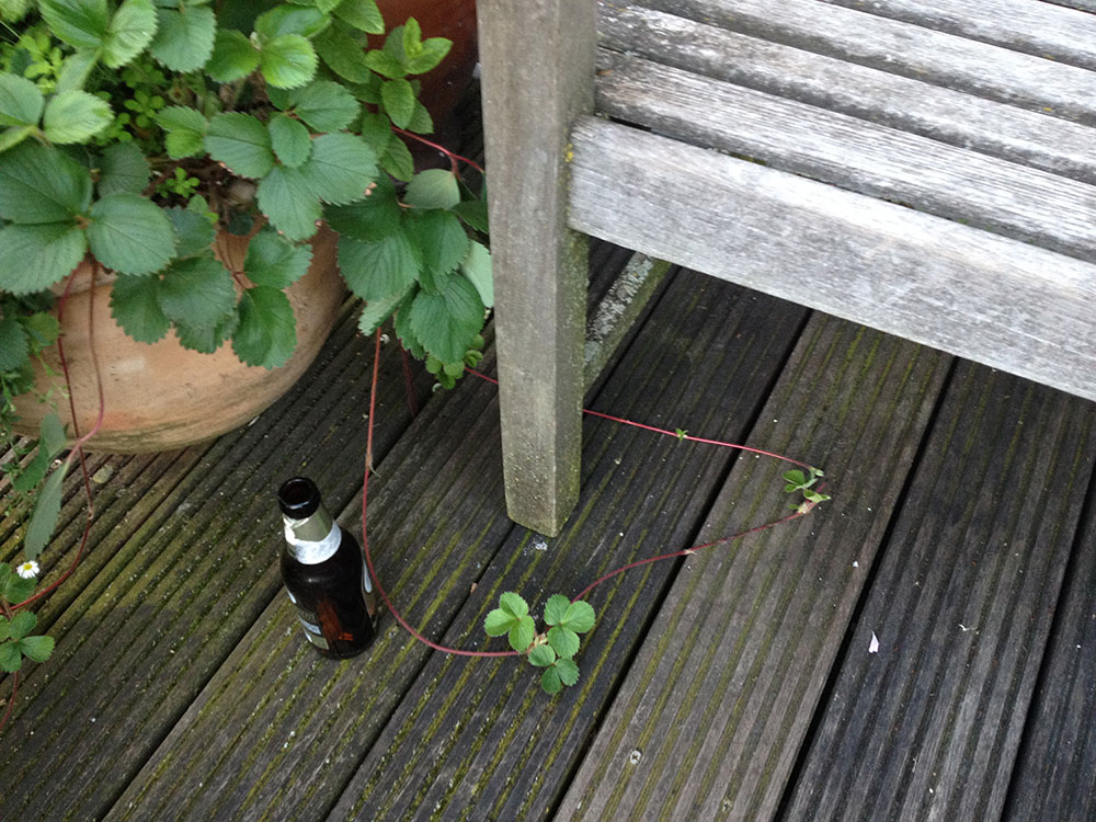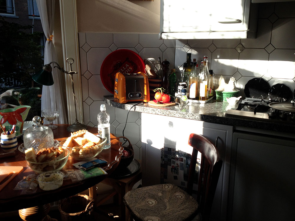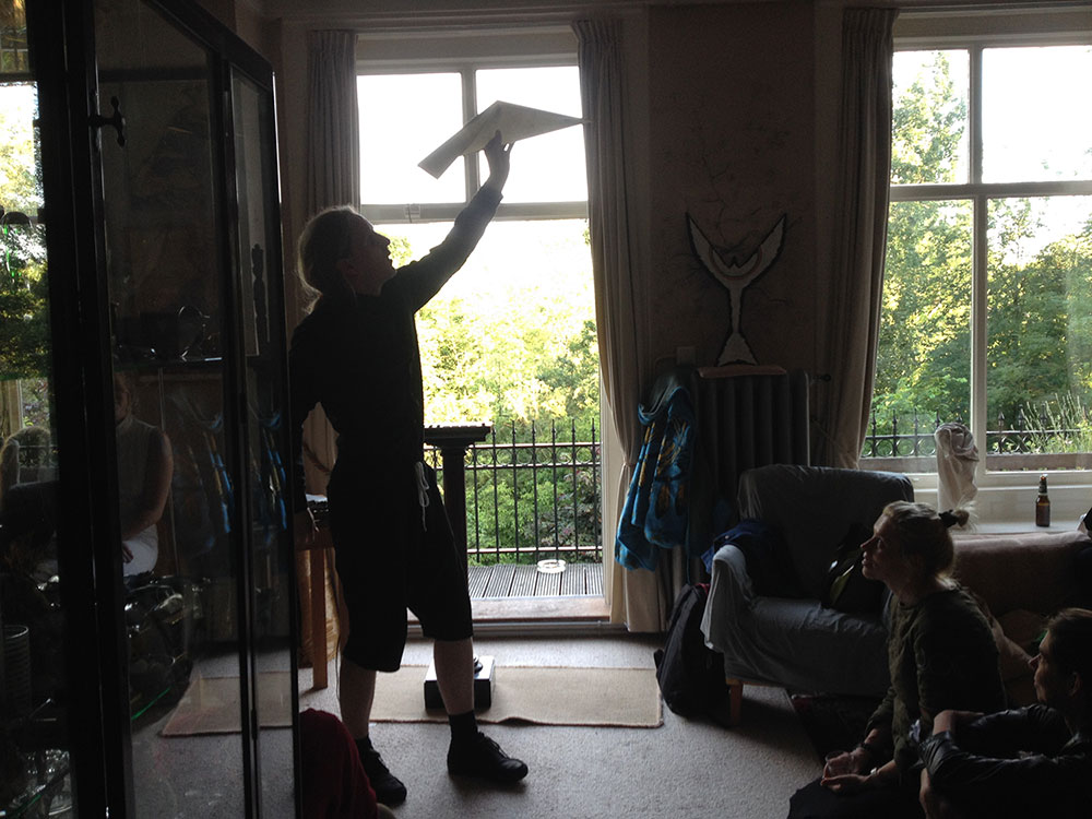 Kerouac is right: the treetops are dancing ecstatically. Clouds as swipes above us. Such a beautiful mansion and than that pvc pipe. Looking into the gardens – that wealth, is it treating you nicely? I think so – here money has been transferred into green lushness. The green budgerigars flying through it complete it. To my right another house, through the window I see a puzzled person at a table with hands on his head. When I look closer I see it’s a big bunch of roses in a vase. In the meantime we wait; cigarettes are lighted as we wait for the blond-haired Icelandic boy with the frame around his neck to begin his thing.