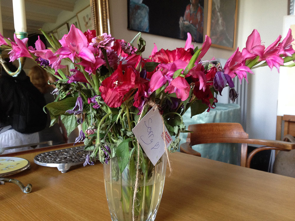 People chat while awaiting the promised performance. A bouquet of pink and red flowers placed on the dinner table trigger me. It says "sorry" on the attached card.