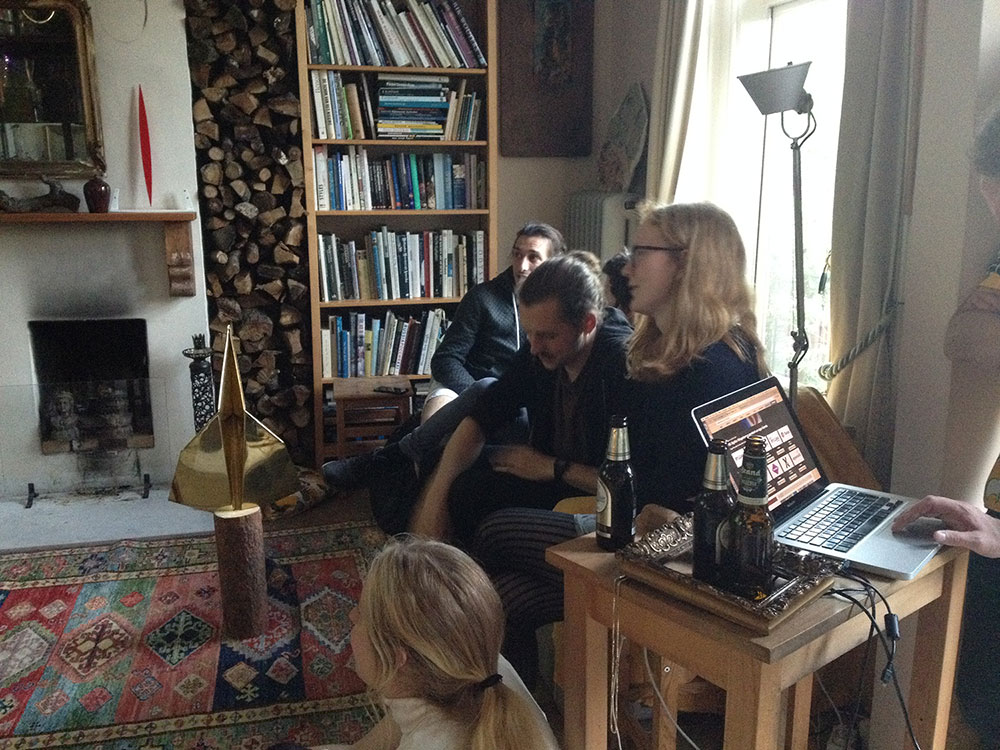 The smell of dark wood and stairs that spiral into infinity. Welcomed by a sweet Polish face with blonde hair. Arriving in the space. Beige, frames, white, beige, frame – also hanging around Styrmirs neck. Through the glass case I see a familiar redheaded girl sitting on the couch – Jip. I look closer at the glass case filled with stuff and wonder which scent would be released if you open those doors. The scent of years. The scent of use and neglect. At the bottom a technicolor piece of cake.